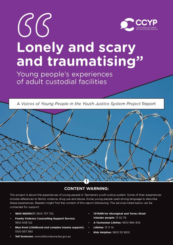 “Lonely and scary and traumatising” – Young people’s experiences of adult custodial facilities (March 2026) shares the views of children and young people in Tasmania’s reception prison watch-houses, police watch-houses, police cells and court cells.