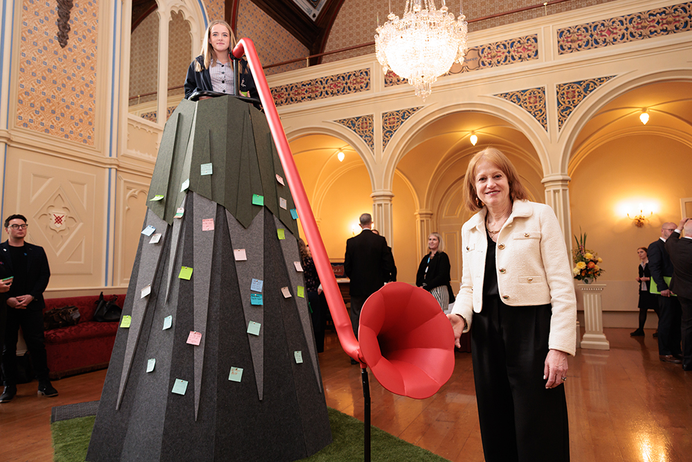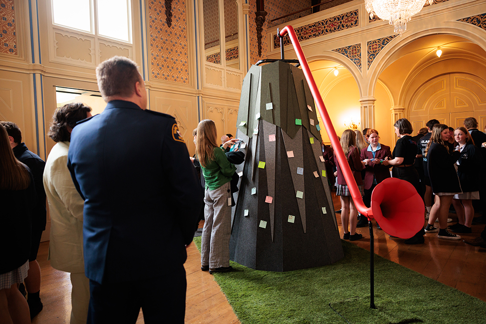 “Only children and young people can climb the Mountain and speak into the megaphone at its summit, sharing their “Power Statements” to remind adults of why their voices matter. Young people are also invited to write a “Power Statement” or draw a picture on a Post-it note, which they can fix to the slopes of the Mountain. As their statements build up, each young person who climbs the Mountain is symbolically lifted by the voices of their peers.” – Remarks made by a member of the VTY at the July 2024 launch event
